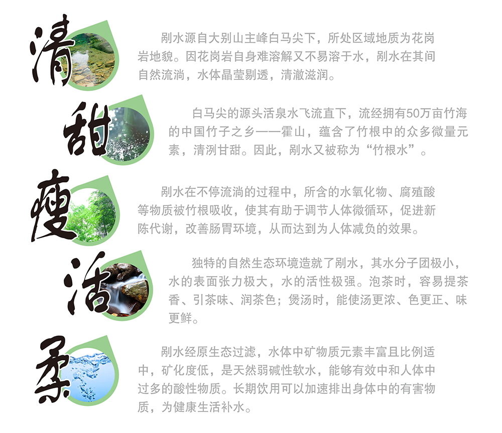 剐水,剐(guǎ) 去除的意思,大别山区民间方言。源于白马尖的山涧泉水飞流直下,流经大别山50余万亩生态竹海,水体经竹根和花岗岩石的层层过滤,使其水体饱满、纯净、水质清澈、清洌甘甜。山里人世代饮之,俗称“剐水”,又谓“竹根水”。
